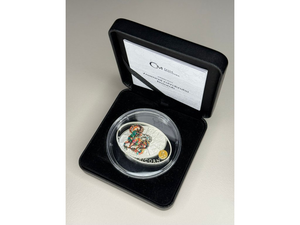 Sbírková stříbrná mince „Kozoroh“ z edice znamení zvěrokruhu, vyražená Českou mincovnou pro stát Niue. Krásně kolorovaný motiv, proof kvalita a nízký náklad – ideální pro sběratele i jako luxusní dárek.