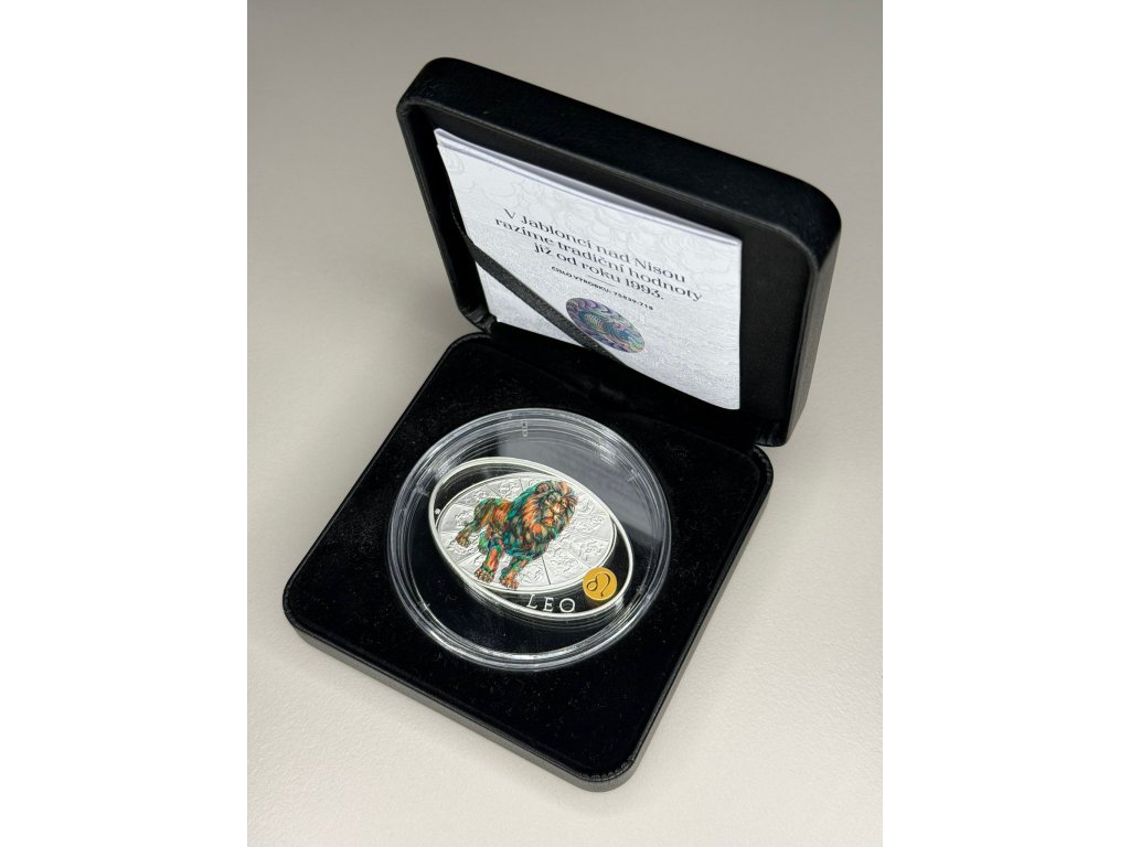 Sbírková stříbrná mince „Lev“ z edice znamení zvěrokruhu, vyražená Českou mincovnou pro emitenta Niue. Detailní kolorovaný motiv a špičková proof kvalita dělají z téhle mince krásný sběratelský kousek i elegantní dárek.